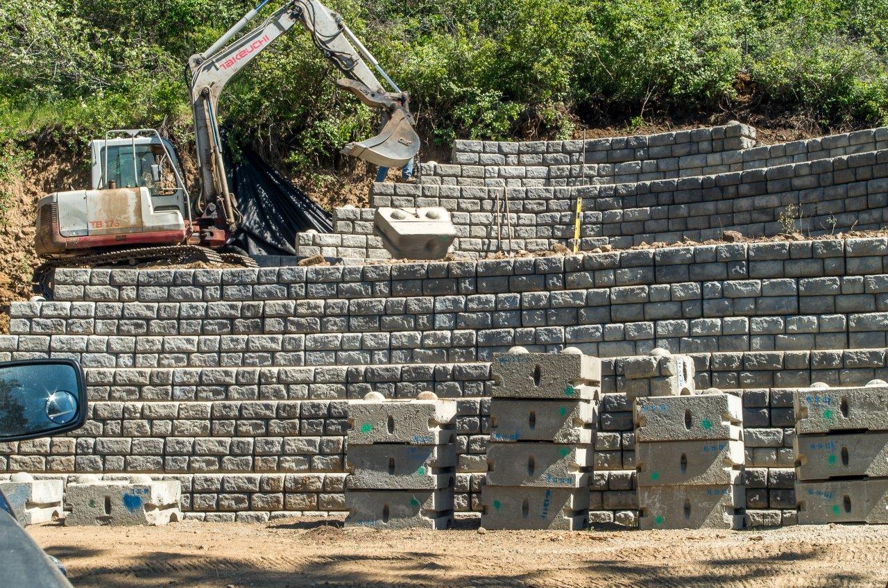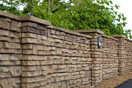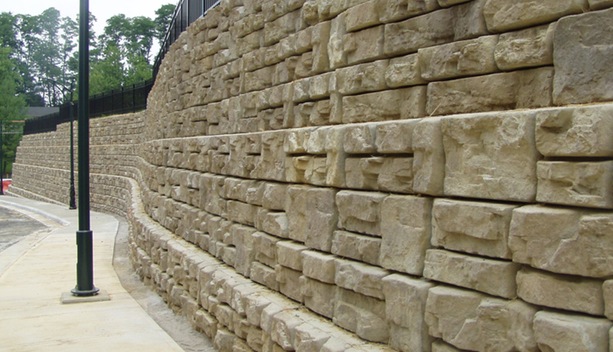 Redi-Rock’s retaining walls utilize blocks weighing approximately one ton each. The massive scale of the system allows walls to be built much higher than other wall systems without using geogrid or tie-backs. Taller reinforced retaining walls can be designed with our geo-connector. Redi-Rock products capture the “Essence of Natural Rock”. Redi-Rock has developed its product line with attention to natural hardscapes and thus developed a system that looks so natural that many mistake it for quarried stone.